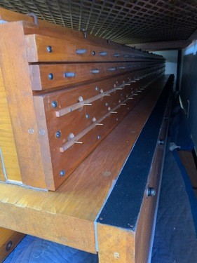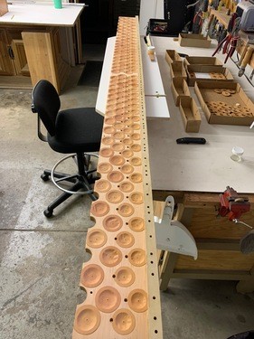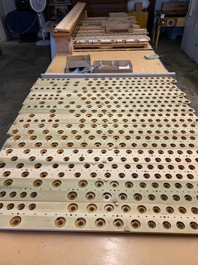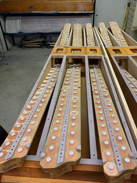 New pitman valves for the Solo chests. Looking at a wind chest from above, it is a large X-Y grid. Notes of the keyboard are the Y-axis, and each stop (English Horn, French Horn, etc.) are the X-axis. The pitman valves are what engages the X-axis, allowing particular sounds to play when an organist presses a key, which would engage the Y-axis (primary valves).