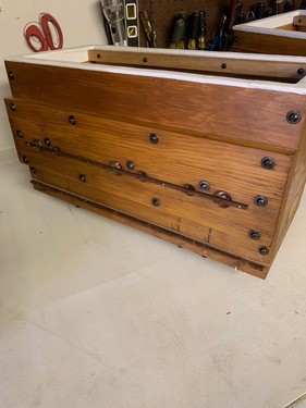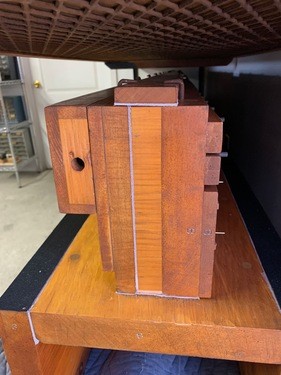 Side profile of a restored wind chest in the Solo. Note the new leather gasket material between the various components of the chest.