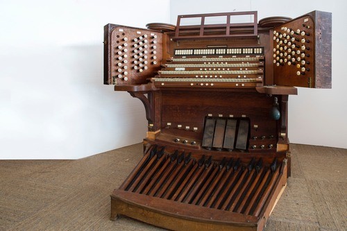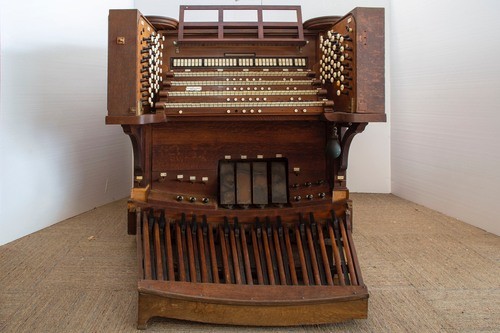The console of E.M. Skinner Op. 459 in Watertown, MA before removal and restoration.